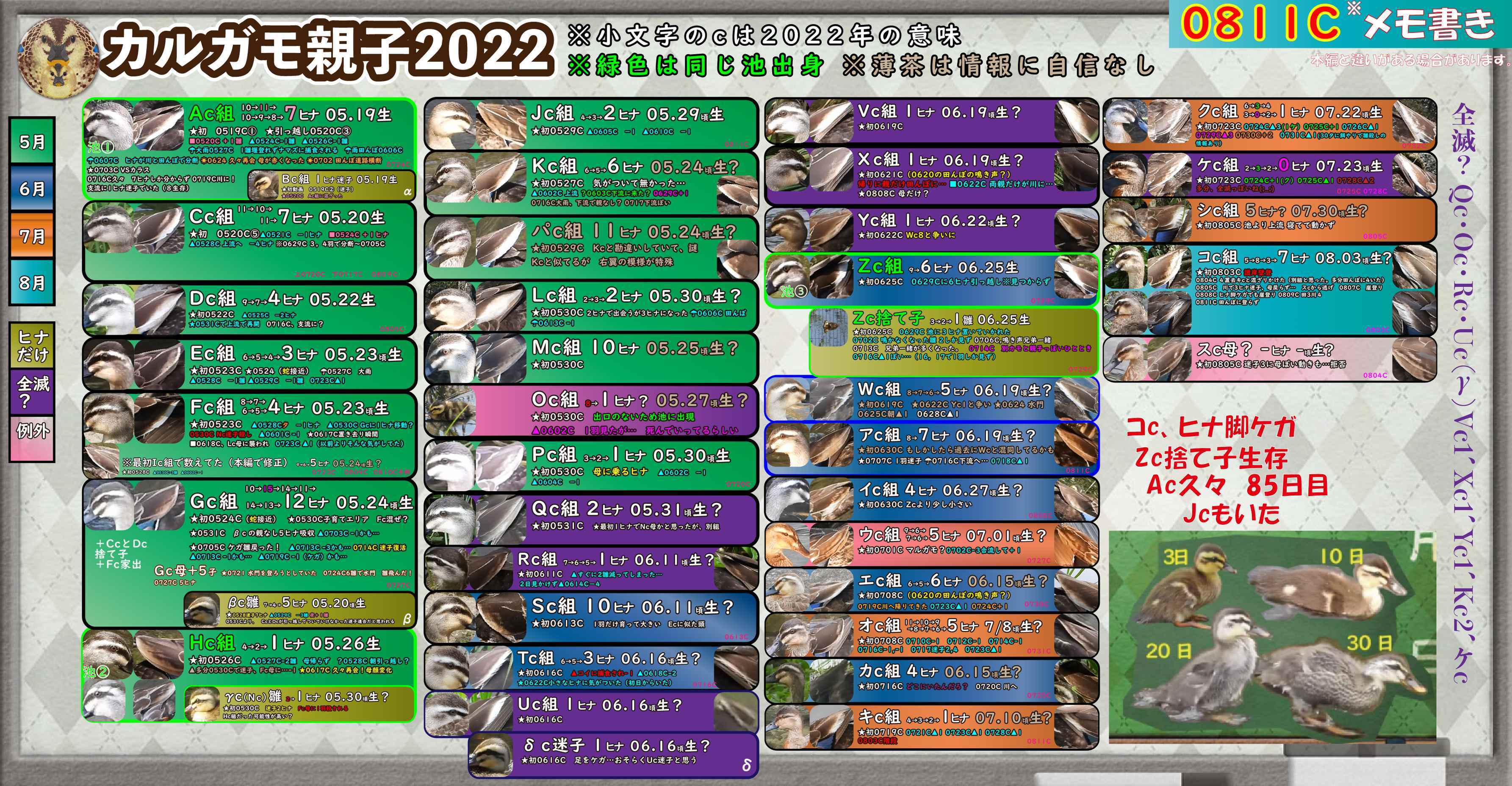 というわけで今回はここまで。コc、とうとう田んぼに登らない日が来た。まだ登ろうとはしてたけど…日中を川で揃って過ごす様子が見られて良かった。川の暮らしは…母無しで生き延びてきたヒナのほうが先輩だね💦明日もちょっと追いかけ気味に様子を見てみます!キc1にも出会えてよかった。さて8月も中旬だけど…今年はコc組が最後になるかな?未だに最初のAc組も認識できてて、表が小さく見づらいのが申し訳ない。
